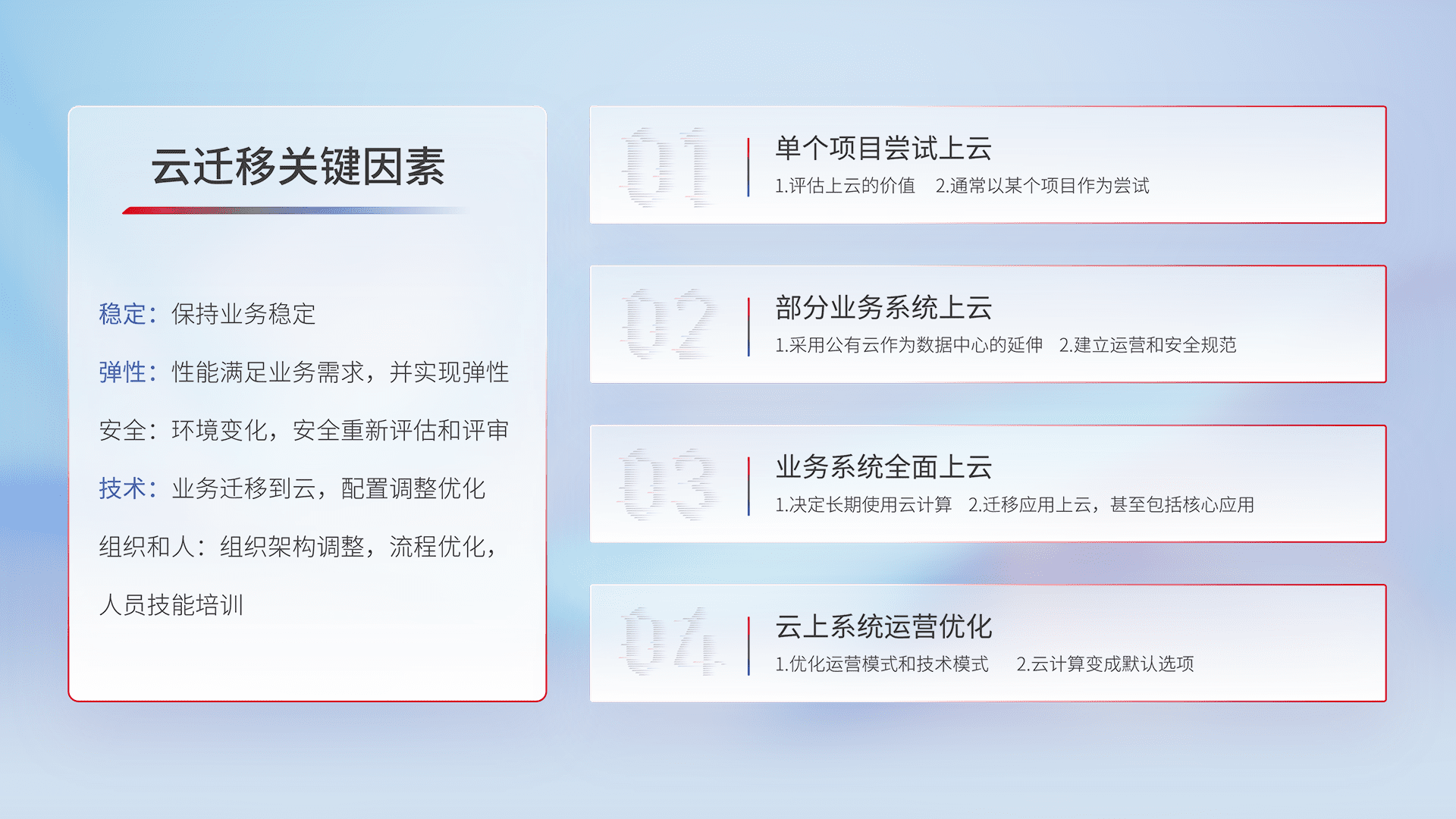 结合实际业务,,,从规划设计、、、、云平台选型、、、云原生改造、、、数据迁移、、集成交付,,,迁移全过程为客户识别最佳上云路径,,做好风险识别管理,,设计网络架构、、身份权限、、、安全审计合规、、、操作审计、、日志审计、、、监控告警策略、、、、多站点容灾设计等,,,,对云上基础设施进行整体规划,,提升IT治理水平,,,,以满足弹性、、、高可用、、高性能的需求。。。。